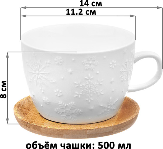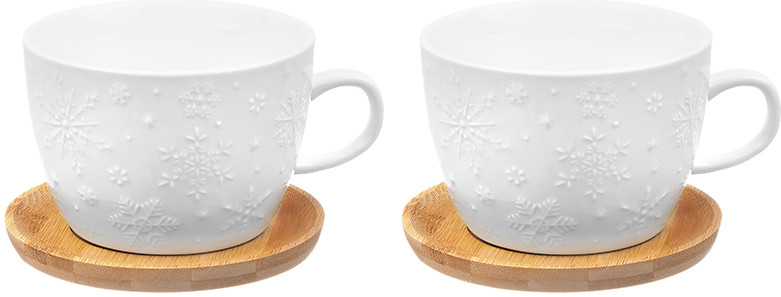 Набор серии «Снежинки» состоит из 2-х чашек с бамбуковыми подставками. Такие чашки помогут провести множество приятных завтраков с любимым кофе или уютных вечерних чаепитий. Чашки выполнены из высококачественного фарфора и украшены рельефными снежинками. Они привнесут атмосферу зимнего волшебства с хлопьями снега, морозными узорами и танцующими кружевными льдинками. Чашки без блюдец можно использовать в микроволновой печи и посудомоечной машине. Блюдца нельзя замачивать. Набор поставляется в стильной картонной упаковке. Чашки с блюдцами из серии посуды «Снежинки» смогут стать настоящим украшением кухни или приятным подарком для ваших родных и близких!