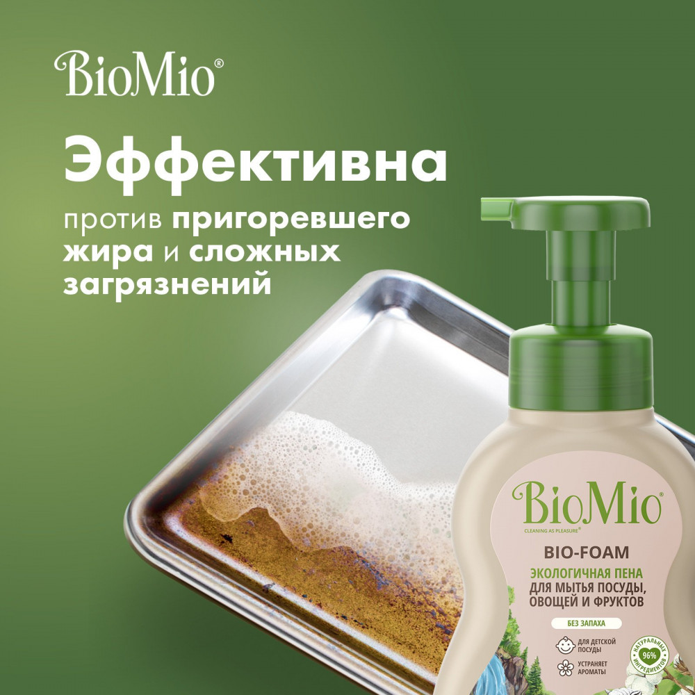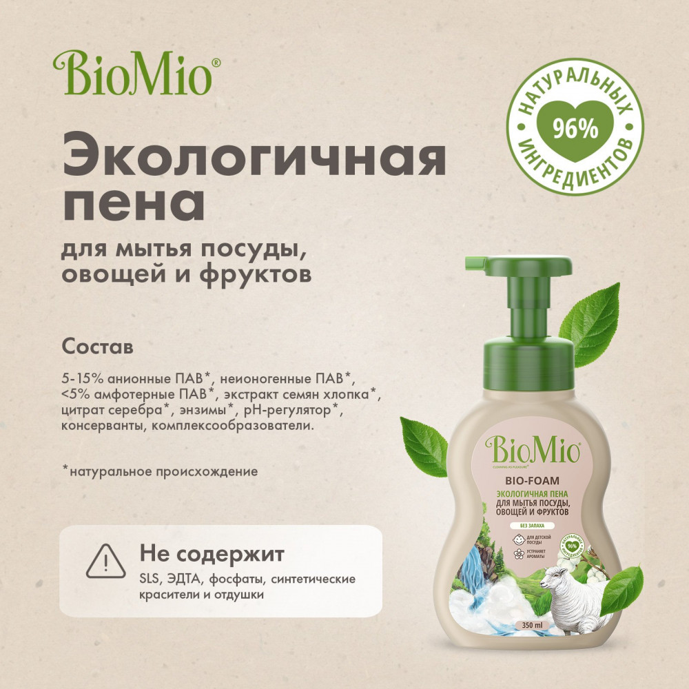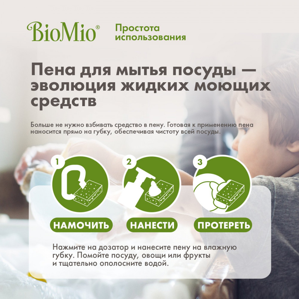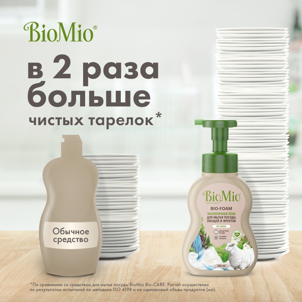 Bio-foam — это настоящая эволюция средств для мытья посуды. В одном флаконе сочетаются эффективность, экологичность и экономичность. Благодаря запатентованному комплексу из природных сахаров и энзимов натурального происхождения пена легко и быстро справляется с пригоревшим жиром, стойкими загрязнениями и запахами. Пенная текстура формулы позволяет использовать средство дольше, чем классический гель для мытья посуды: 1 мл Bio-foam отмывает в 2 раза больше посуды по сравнению с 1 мл жидкого средства BioMio