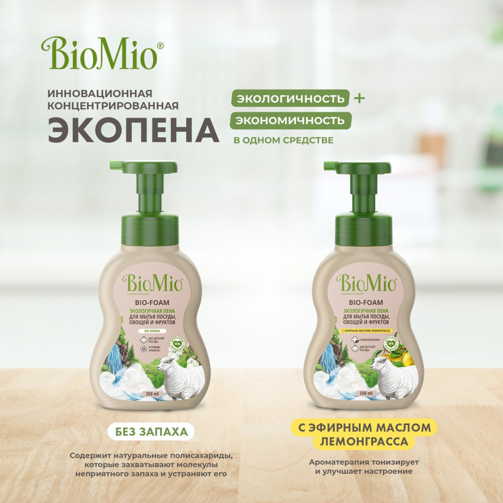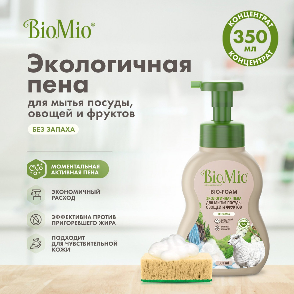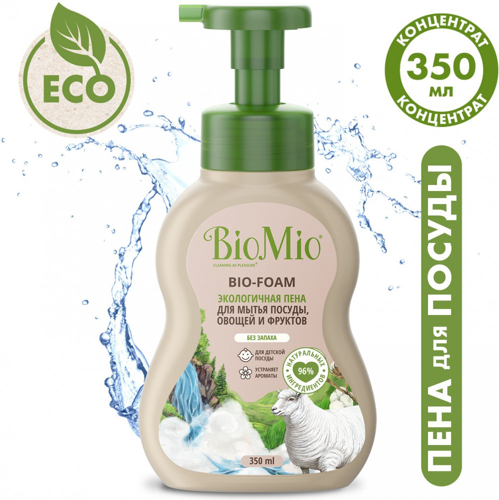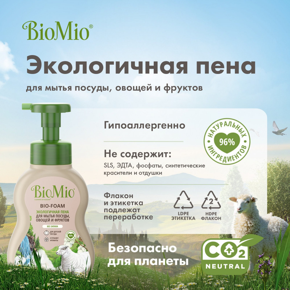 Bio-foam — это настоящая эволюция средств для мытья посуды. В одном флаконе сочетаются эффективность, экологичность и экономичность. Благодаря запатентованному комплексу из природных сахаров и энзимов натурального происхождения пена легко и быстро справляется с пригоревшим жиром, стойкими загрязнениями и запахами. Пенная текстура формулы позволяет использовать средство дольше, чем классический гель для мытья посуды: 1 мл Bio-foam отмывает в 2 раза больше посуды по сравнению с 1 мл жидкого средства BioMio