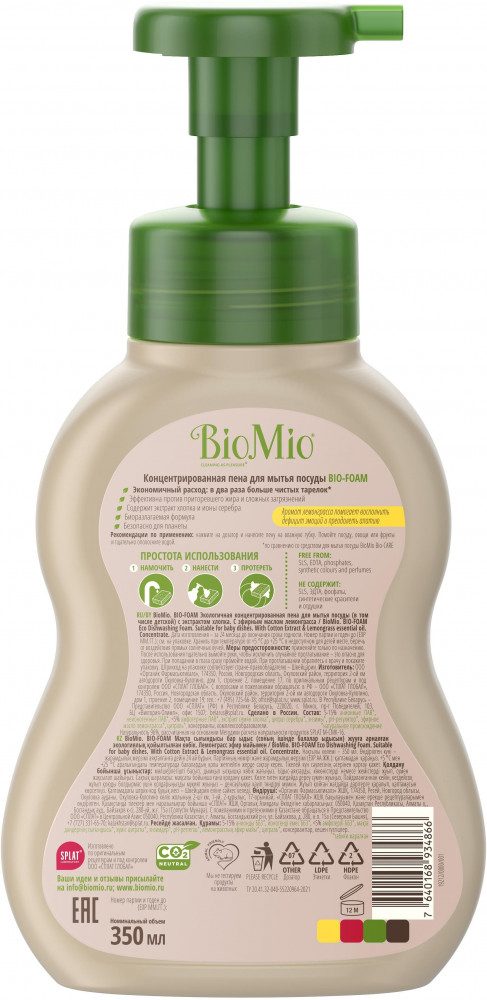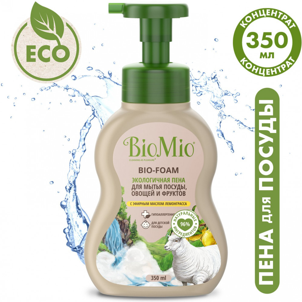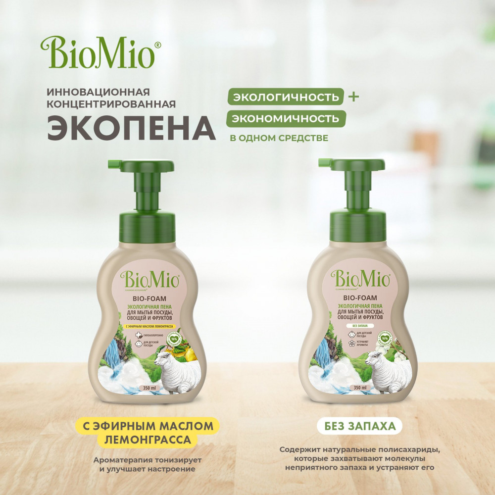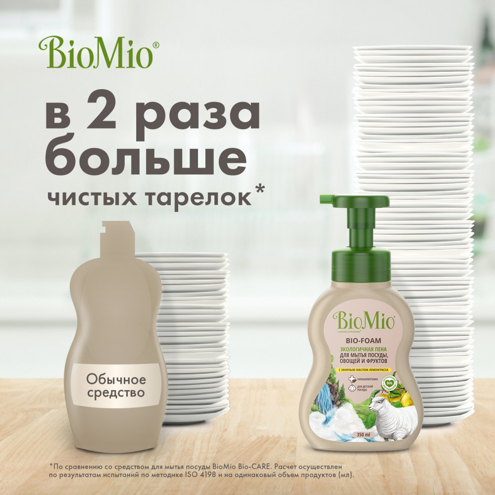 Bio-foam — это настоящая эволюция средств для мытья посуды. В одном флаконе сочетаются эффективность, экологичность и экономичность. Благодаря запатентованному комплексу из природных сахаров и энзимов натурального происхождения пена легко и быстро справляется с пригоревшим жиром, стойкими загрязнениями и запахами. Пенная текстура формулы позволяет использовать средство дольше, чем классический гель для мытья посуды: 1 мл Bio-foam отмывает в 2 раза больше посуды по сравнению с 1 мл жидкого средства BioMio