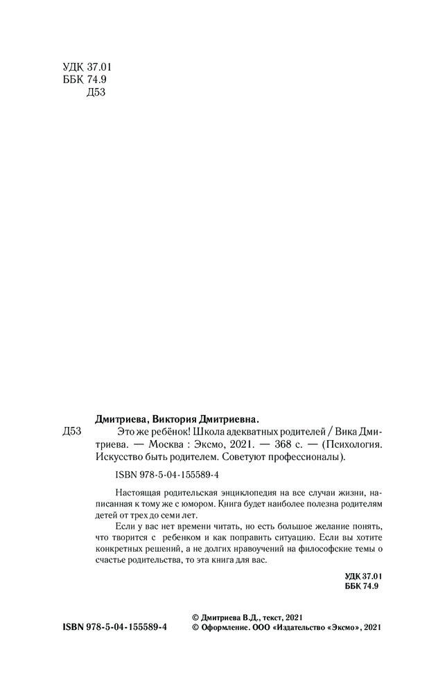 💳 Оплатить за товар можно при получении 🇰🇿 Есть бесплатная доставка по Казахстану 🎁 Копите бонусы с каждой покупки Настоящая родительская энциклопедия на все случаи жизни, написанная, к тому же, с юмором. Книга будет наиболее полезна родителям детей от трех до семи лет. Если у вас нет времени читать, но есть большое желание понять, что творится с ребенком и как поправить ситуацию. Если вы хотите конкретных решений, а не долгих нравоучений на философские темы о счастье родительства, то эта книга для вас. |