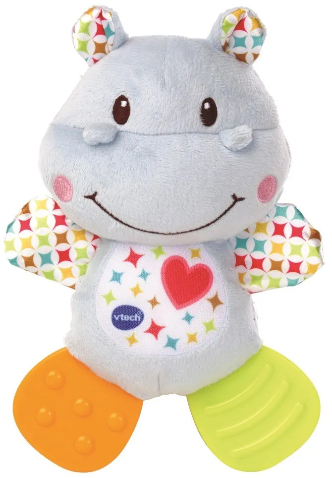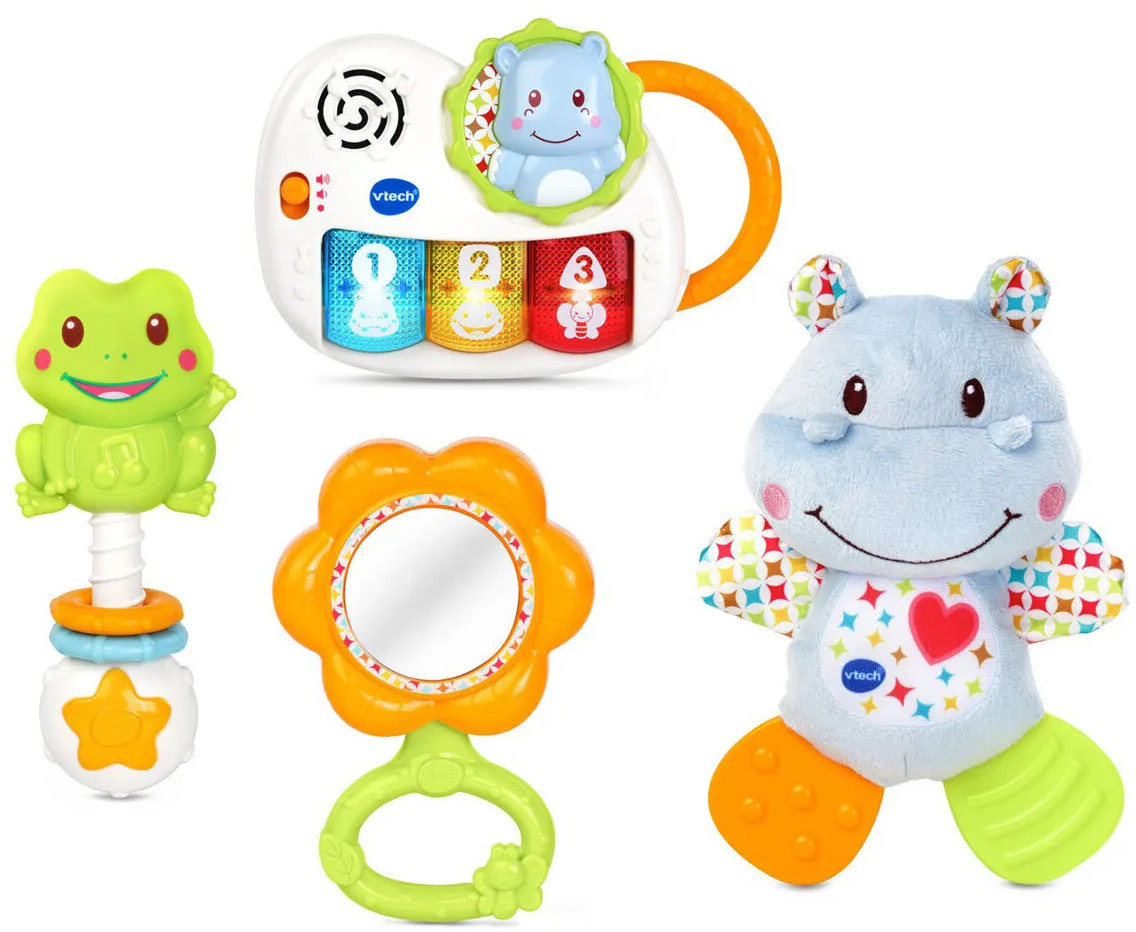 Мягкий плюшевый бегемотик с различными текстурами и мягкими пластиковыми лапками успокаивает прорезывающиеся зубки малыша. Пианино со звуками и светом способствует развитию моторики и слуха ребенка. Зеркало в форме цветка способствует самопознанию. Погремушка-лягушка помогает развитию осязания и моторики.