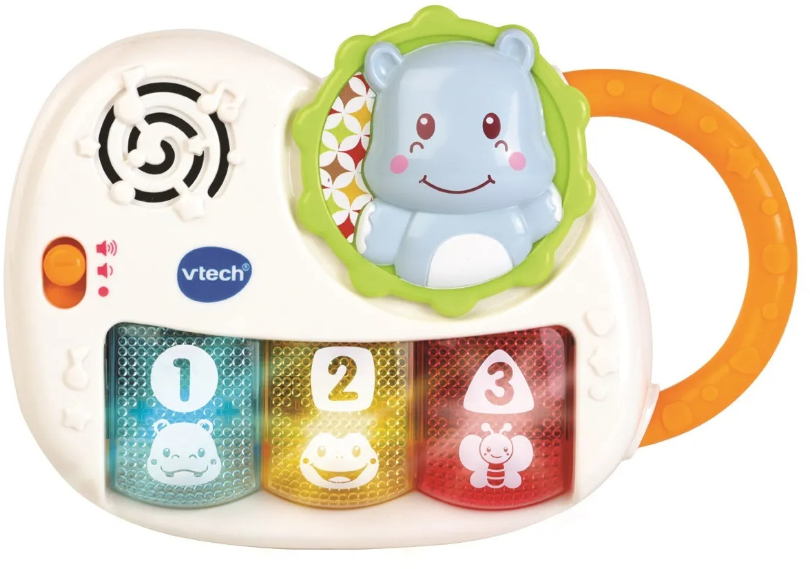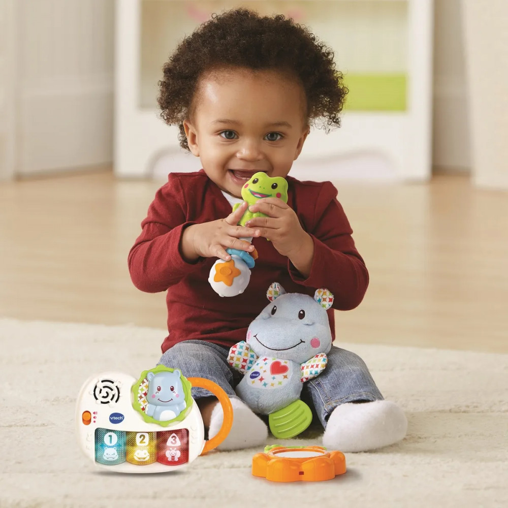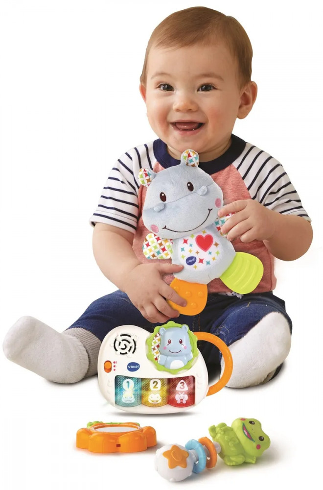 Благодаря электронному пианино малыши узнают свои первые музыкальные мелодии в компании своего друга бегемота. Различные погремушки развивают моторику и стимулируют любопытство, а милая плюшевая игрушка станет спутником для первых открытий.