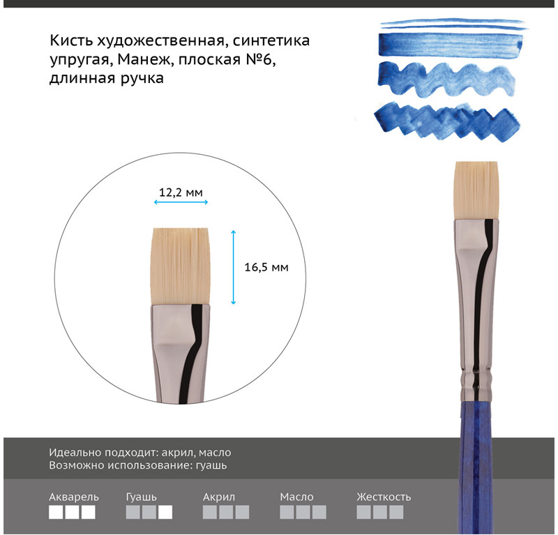 💳 Оплатить за товар можно при получении 🇰🇿 Есть бесплатная доставка по Казахстану от 1 дня 🎁 Копите бонусы с каждой покупки Серия: Манеж Художественные кисти изготовлены из высококачественного синтетического волоса, имитирующего натуральный ворс щетины. Данные кисти предназначены для работы с масляными, акриловыми, гуашевыми красками, медиумами, лаками и пастами. Удобны для нанесения структурных мазков. Форма пучка круглых кистей в виде конуса с идеальным зауженным кончиком позволяет писать крупными, плотными мазками, а также вести тонкую и изящную линию. Длинная глянцевая ручка, окольцованная никелированной обоймой, даёт возможность лучше контролировать работу кисти. Белый цвет волоса позволяет более точно отслеживать чистоту оттенка краски, что увеличивает качество работы с точки зрения колористики, а новый подход к технологии создания синтетики увеличил эластичность и упругость материала. Данные кисти являются полноценной заменой кистям из натуральной щетины. Длинная ручка кисти покрыта глянцевым лаком цвета ультрамарин. Кисть имеет никелированную бесшовную обойму и цветную лакированную ручку. |