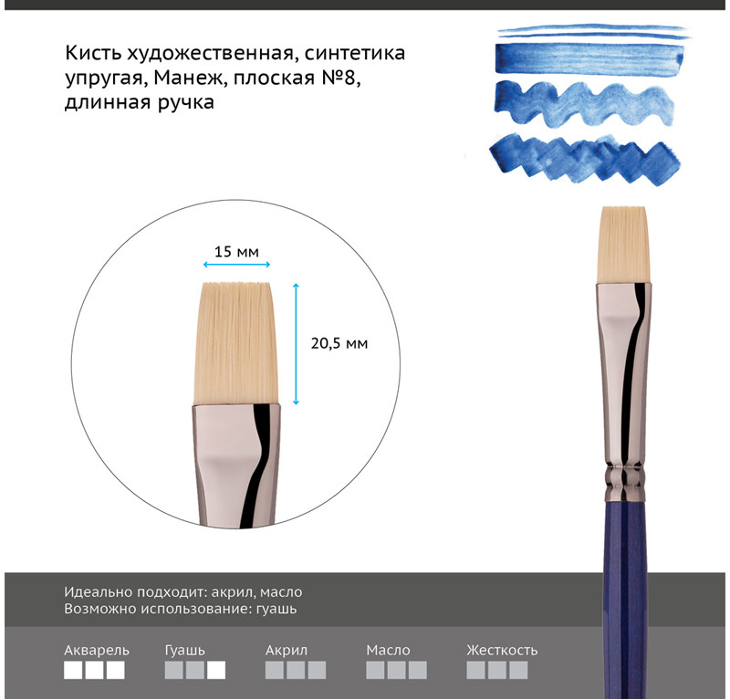 💳 Оплатить за товар можно при получении 🇰🇿 Есть бесплатная доставка по Казахстану от 1 дня 🎁 Копите бонусы с каждой покупки Серия: Манеж Художественные кисти изготовлены из высококачественного синтетического волоса, имитирующего натуральный ворс щетины. Данные кисти предназначены для работы с масляными, акриловыми, гуашевыми красками, медиумами, лаками и пастами. Удобны для нанесения структурных мазков. Форма пучка круглых кистей в виде конуса с идеальным зауженным кончиком позволяет писать крупными, плотными мазками, а также вести тонкую и изящную линию. Длинная глянцевая ручка, окольцованная никелированной обоймой, даёт возможность лучше контролировать работу кисти. Белый цвет волоса позволяет более точно отслеживать чистоту оттенка краски, что увеличивает качество работы с точки зрения колористики, а новый подход к технологии создания синтетики увеличил эластичность и упругость материала. Данные кисти являются полноценной заменой кистям из натуральной щетины. Длинная ручка кисти покрыта глянцевым лаком цвета ультрамарин. Кисть имеет никелированную бесшовную обойму и цветную лакированную ручку. |
