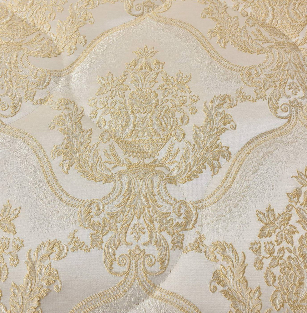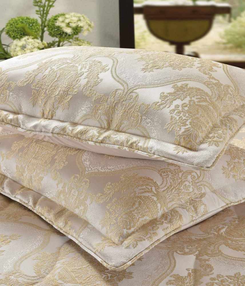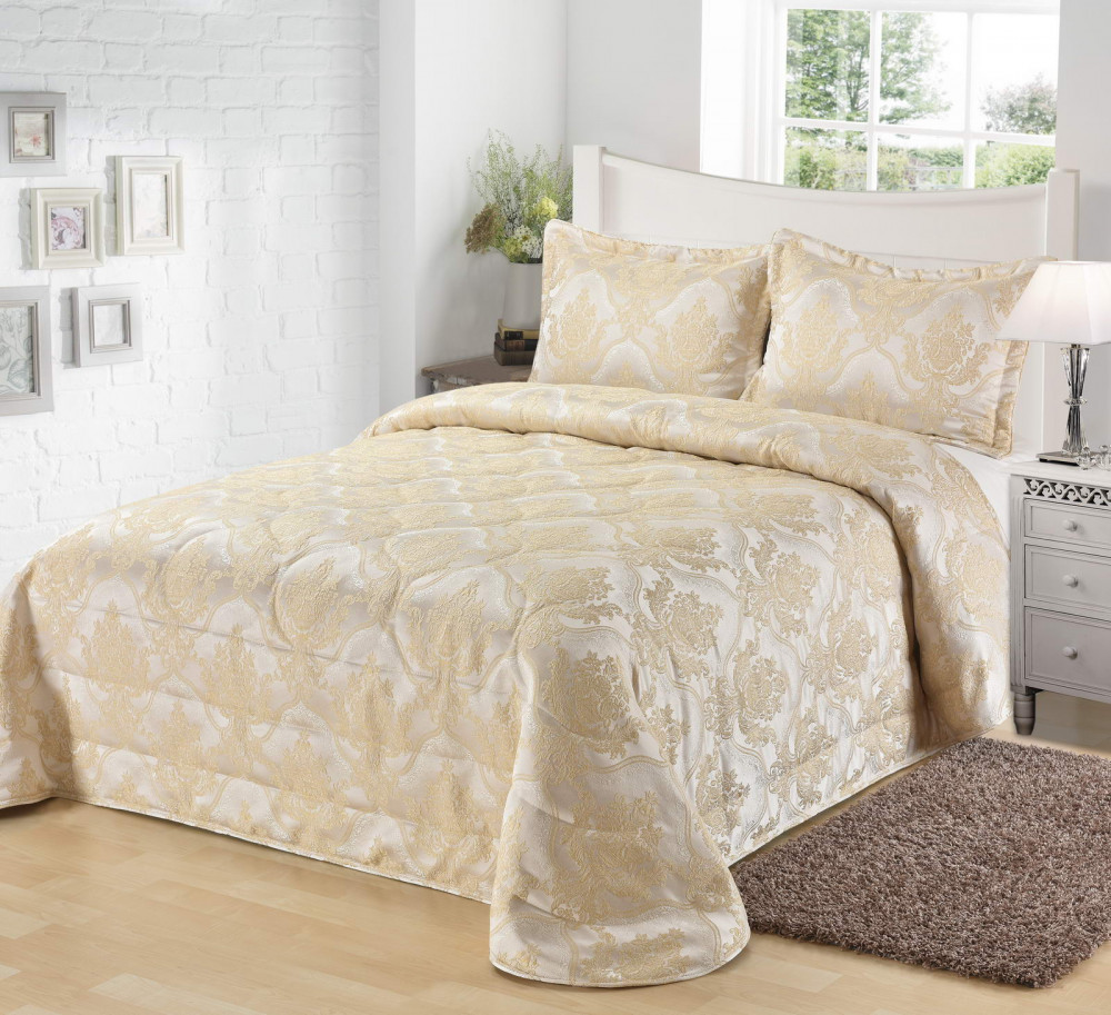 Серия стеганых жаккардовых покрывал из премиальной коллекции Итальянский ренессанс. Стеганое, жаккардовое покрывало на подкладке из плотной декоративной ткани. Отличительной особенностью данной модели является её оригинальный жаккардовый рисунок. Данное стеганое покрывало представляет собой многослойное изделие, внешняя часть изделия состоит из жаккардового полотна, а внутренний наполнитель состоит из силиконизированного волокна плотность которого составляет 100 г/м2. Для того, чтобы внутренний слой не сбивался в комки и создать фактурность внешних слоев, по всей площади покрывала производится простежка (прошивание). Это могут быть ровные линии или фантазийные узоры.