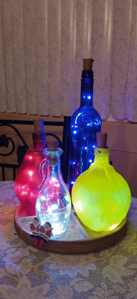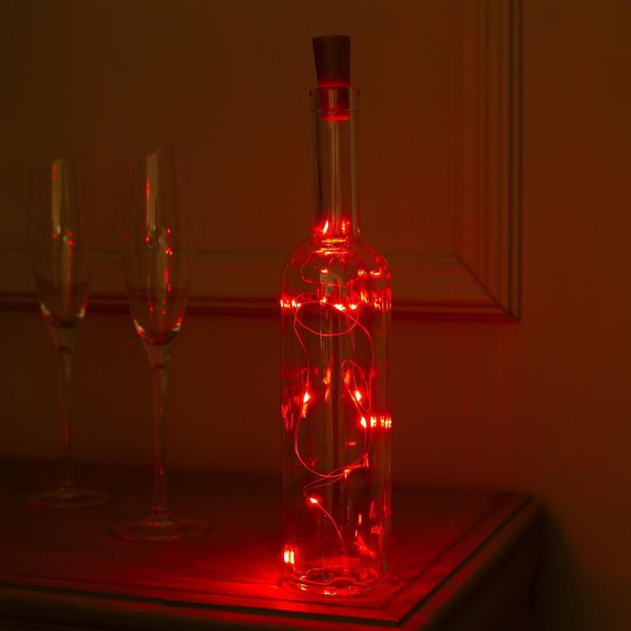 слабо горит, очень быстро сели батарейки, пробка большая для бутылки стандартной