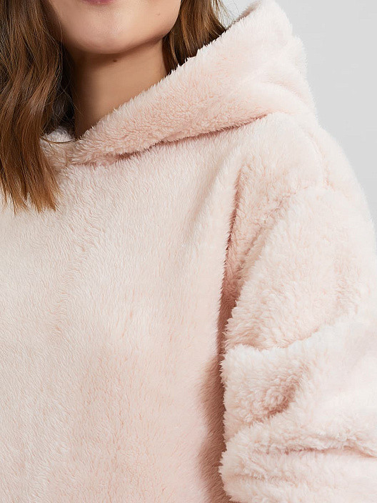 Качество без нареканий. При примерке не электризуется. В молочном цвете сшит как-будто наоборот: снаружи плюшевый, а внутри мохнатый. Хотелось наоборот. В других цветах, судя по фото, мохнатость снаружи. Небольшой оверсайз. Капюшон глубокий. Длина рукавов в M-ке на рост 164. При росте выше будут коротковаты.
