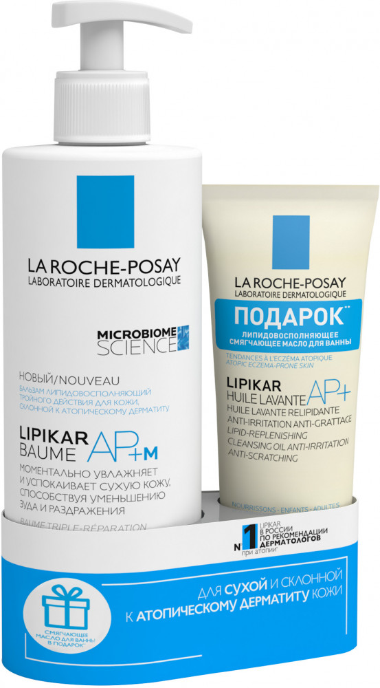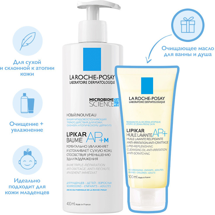 Набор создан для сухой и чрезвычайно сухой, склонной к атопическому дерматиту кожи младенцев, детей и взрослых. Атопичная кожа характеризуется нарушением баланса микробиома, который является невидимым щитом нашей кожи, состоящим из миллиардов микроорганизмов. Сбалансированный микробиом и укрепленный защитный барьер кожи обеспечивают поддержание комфорта кожи и её защиту от внешних факторов. Дерматологическая лаборатория La-Roche-Posay — эксперт в области исследований микробиома кожи. Lipikar Baume AP+м содержит эксклюзивный комплекс ингредиентов Aqua Posae + Microrésyl, который способствует регулированию микробиома кожи, одновременного сохраняя на её поверхности полезные бактерии и сдерживая рост количества стафилококков, способствующих развитию инфекции. Липидовосполняющее смягчающее масло для ванны и душа Lipikar Cleansing Oil AP+ содержит уникальный запатентованный ингредиент Aqua Posae Filiformis, который способствует восстановлению микробиома кожи.