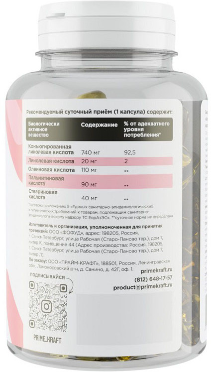PRIMEKRAFT Биологически активная добавка к пище «CLA»-20% +141 соответствие описанию соответствие упаковке количество капсул послевкусие отсутствует неэффективность