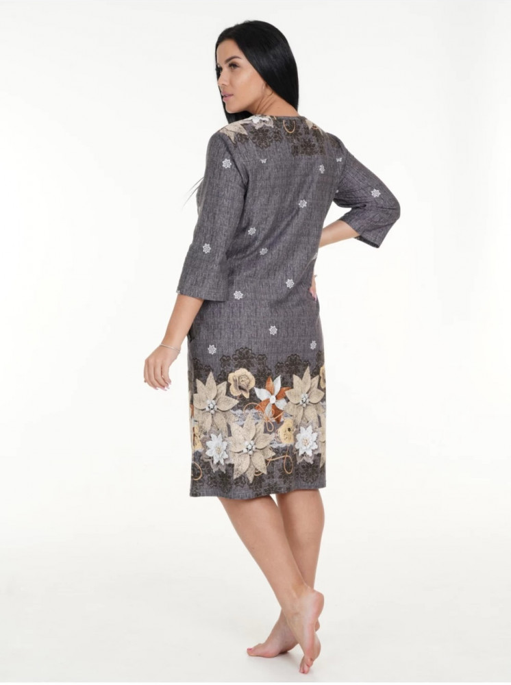 Халат хорош. Хотя и трикотаж, но тянется несильно. Цвет не коричневый, а серо-коричневый, причём ближе к серому, неяркий, неконтрастный. При моём росте 170 прикрывает колени. Рукава свободные, небольшие карманы.