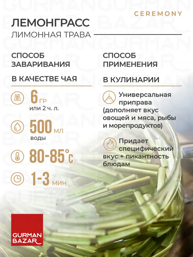 Упаковка большая, нарезан лемонграсс крупно. Вкус в чае пока не поняла, но заваривается нормально. Измельчить дальше в ступке - не вариант, так как трава тонкая и сухая-сухая. Думаю приобрести новую мельницу чисто чтобы в блюда лемонграсс можно было добавлять)