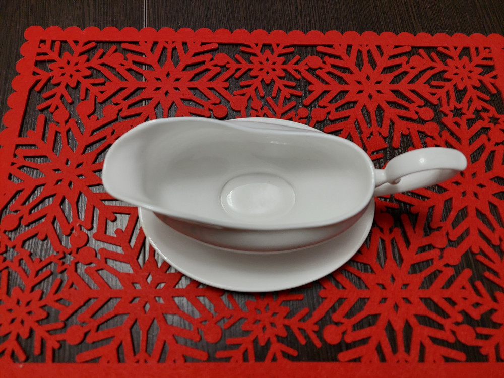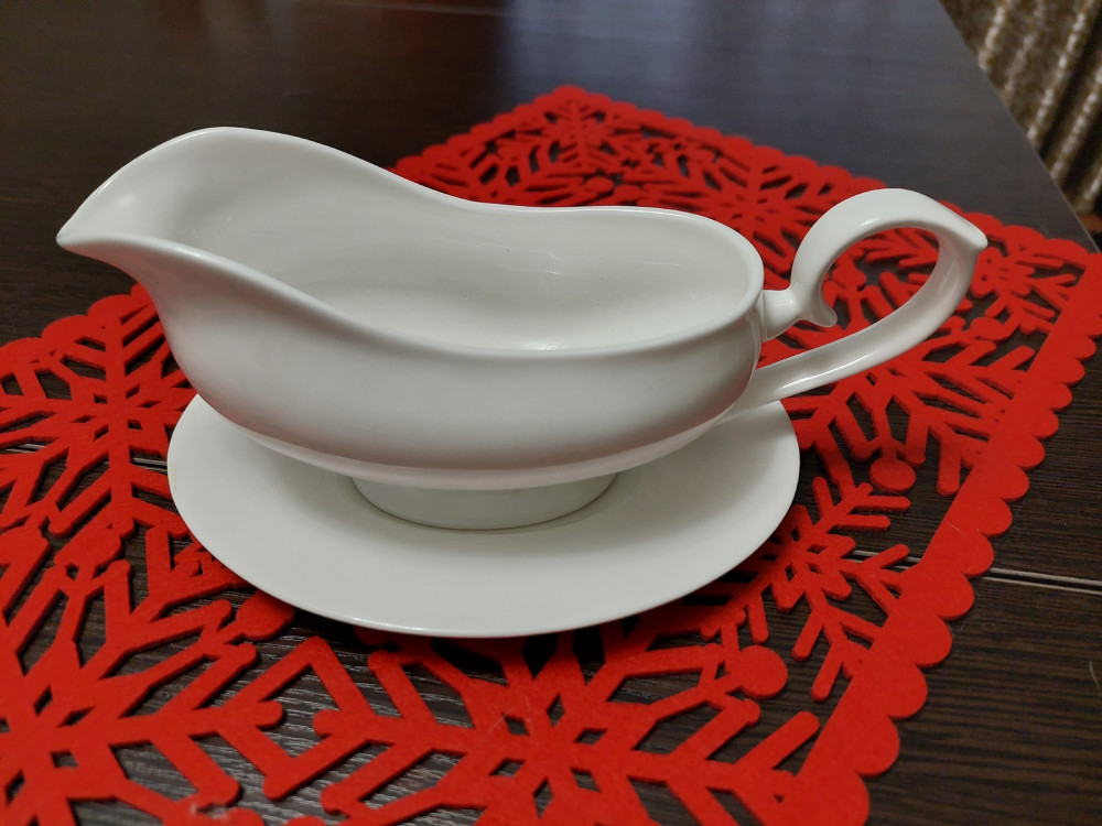 Очень изящная соусница, заказала одну, посмотрела на неё — и сразу заказала вторую. Удобно, что она сразу с блюдцем в комплекте — не надо подбирать подходящее блюдечко, чтобы ставить на него соусницу и не допускать падения капель с носика на скатерть.