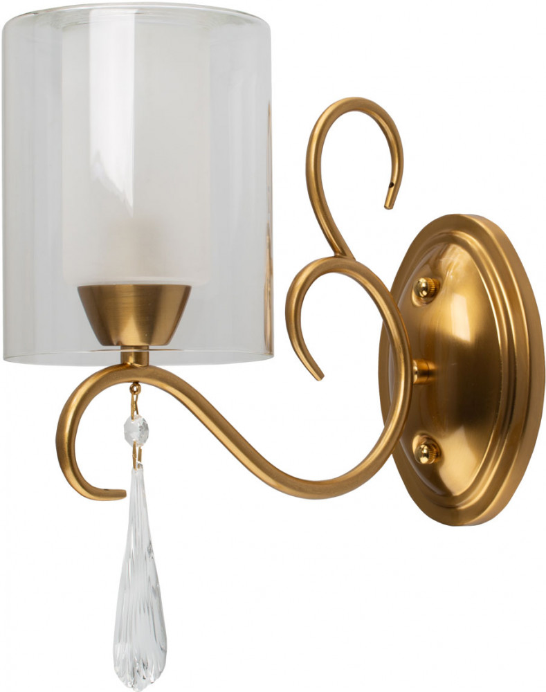 Металлическое основание светильника гальванизировано в цвет бронзы. Двойной стеклянный плафон, отлит в сложную форму. Внутренний плафон матирован, внешний — прозрачный. Светильник декорирован прозрачным хрусталем оригинальной формы.