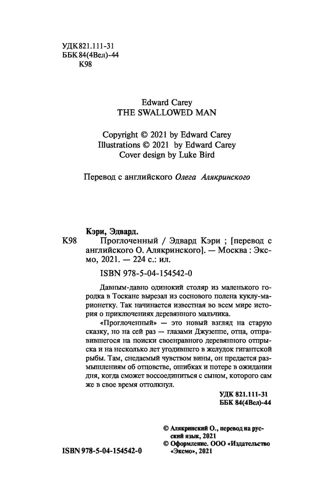 ПроглоченныйВ данный момент этот товар отсутствует в продаже. Возможно, у нас найдется аналогичный или похожий товар здесь. Серия: Литературные хиты: Коллекция «Я пишу эти строки на страницах чужого журнала, при свече, в чреве гигантской рыбы. Меня проглотили». Давным-давно одинокий столяр из маленького городка в Тоскане вырезал из соснового полена куклу-марионетку. Так начинается известная во всем мире история о приключениях деревянного мальчика. «Проглоченный» — это новый взгляд на старую сказку, но на сей раз — глазами Джузеппе, отца, отправившегося на поиски своенравного деревянного отпрыска и на несколько лет угодившего в желудок гигантской рыбы. Там, снедаемый чувством вины, он предается размышлениям об отцовстве, ошибках и потере, в ожидании дня, когда сможет воссоединиться с сыном, которого сам же в свое время оттолкнул. |