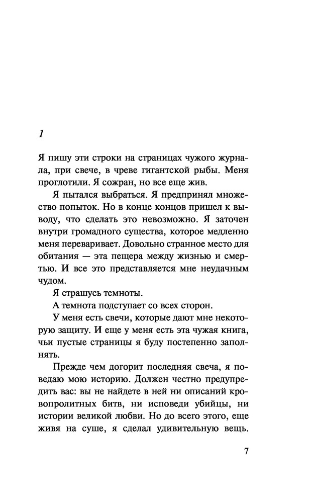 Книга отличная, хотя подойдет далеко не для каждого. Написана в форме дневника главного персонажа который попал внутрь большой рыбы или морского существа.