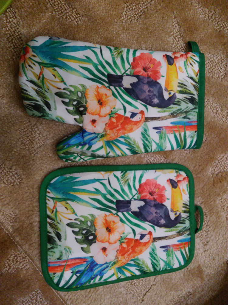 Полностью соответствуют описанию. Яркие, красивые, толстые! С оборотной стороны какой то плотный шуршащий материал, думаю для лучшей защиты от высокой температуры. Не знаю как правильно описать этот материал ну в общем не просто ткань.
