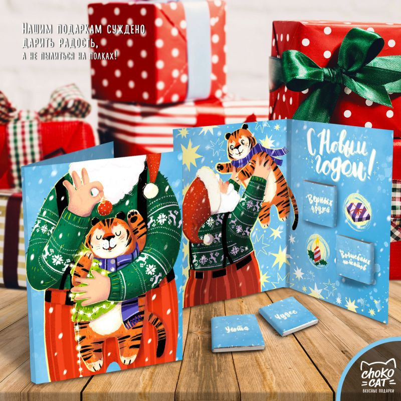 ChokoCat Открытка с шоколадом «Дед мороз и тигр»В данный момент этот товар отсутствует в продаже. Возможно, у нас найдется аналогичный или похожий товар здесь. Серия: Открытки Яркая и современная открытка, внутри которой четыре молочных шоколадки по 5 граммов. Шоколадки обёрнуты в индивидуальные этикетки, каждая имеет иллюстрацию и надпись в тематике набора. Сам шоколад изготовлен из бельгийского качественного сырья, в составе от 36,8% сухого остатка какао. Пусть Новый год откроет новые горизонты в жизни и наполнит её приятными событиями! |