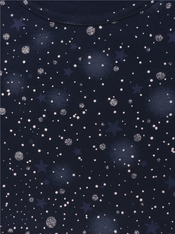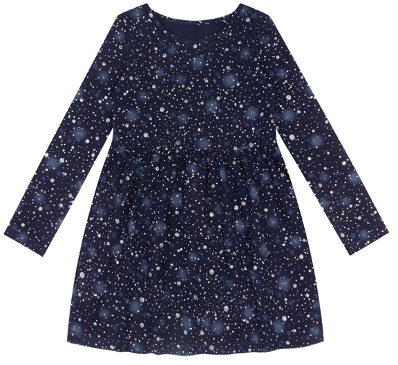 Девочке 5 лет подошёл размер 116. Брали тёмно-синего цвета. Смотрится красиво- как звёзды на ночном небе; нарядное. Платье х/б.