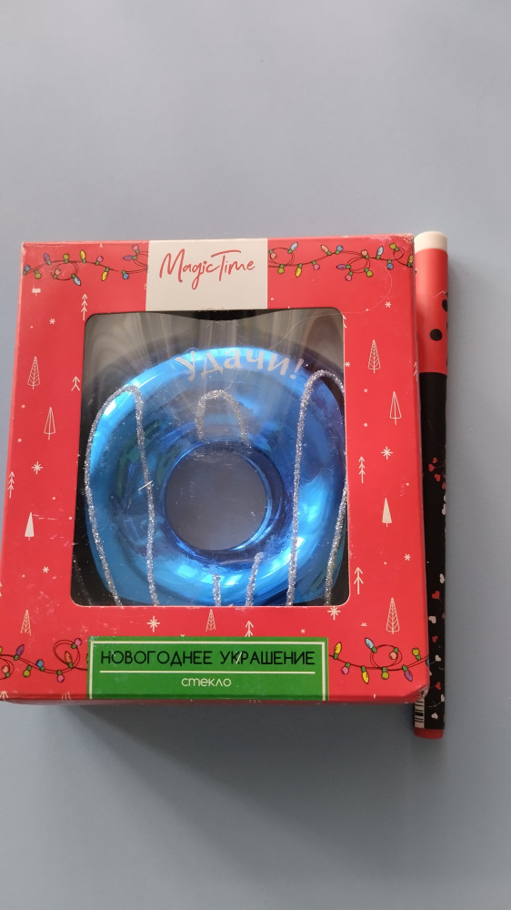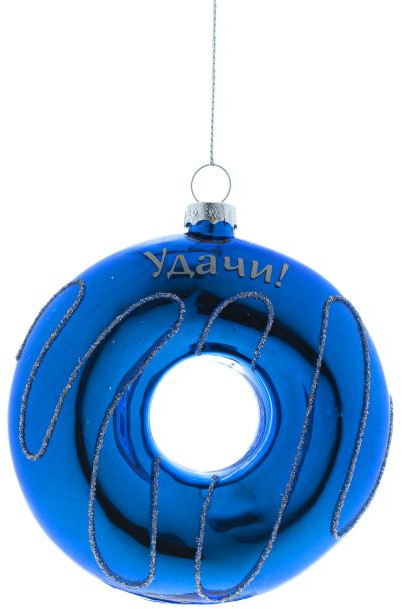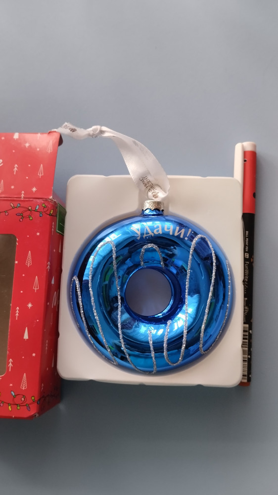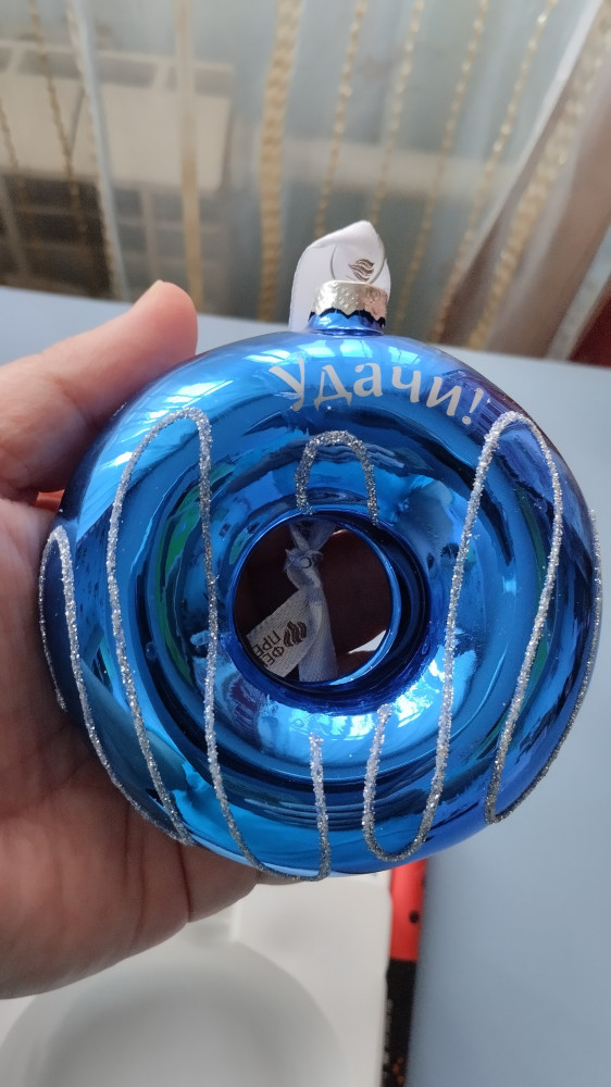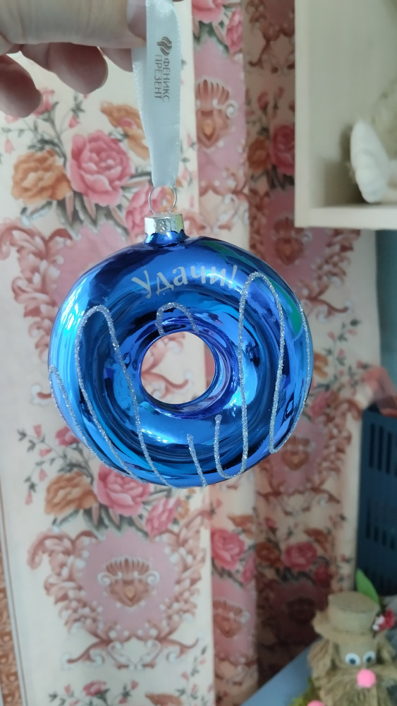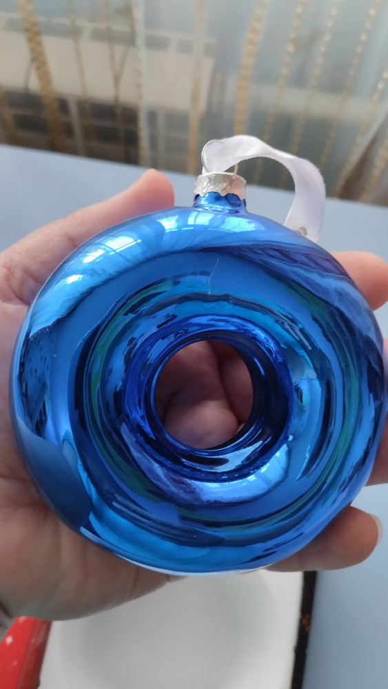 Большая, яркая, красивая, насыщенный синий цвет, блеск не стёрт. Не знаю видно ли на фото, но игрушка немного ассиметрична. Словно верх и низ пончика взяли и сдвинули в разные стороны. На висящей игрушке этого незаметно, так что общего впечатления не портит. С обратной стороны нет блестящих разводов. Пришла немного поцарапан ой с обратной стороны, почти незаметно. Оставила несмотря на недочёты, уж очень цвет понравился и скидка была неплохая, не стала перезаказывать. Рекомендую.