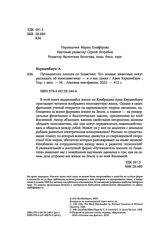 💳 Оплатить за товар можно при получении 🇰🇿 Есть бесплатная доставка по Казахстану 🎁 Копите бонусы с каждой покупки Наши представления об инопланетянах как о необычной форме жизни зачастую основаны на зрелищных голливудских фильмах и фантастических рассказах. Однако биологические законы, действующие на нашей планете, работают во всех уголках Вселенной. Опираясь на свои профессиональные знания, наблюдения за животными и дарвиновскую теорию эволюции, зоолог Арик Кершенбаум рассказывает о том, какие черты, свойственные обитателям Земли, могут быть присущи формам инопланетной жизни. |