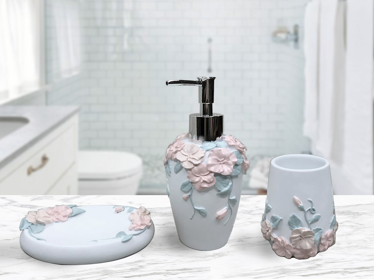 Sofi De Marko Набор для ванной комнатыВ данный момент этот товар отсутствует в продаже. Возможно, у нас найдется аналогичный или похожий товар здесь. Набор состоит из 3-х предметов. Диспенсер можно использовать для мыла, шампуня, массажного масла или бальзамов. В стакане можно разместить зубные щетки, пасту, крема или мази и другую необходимую косметику. Такой набор сможет стать стильным дополнением ванной комнаты. |