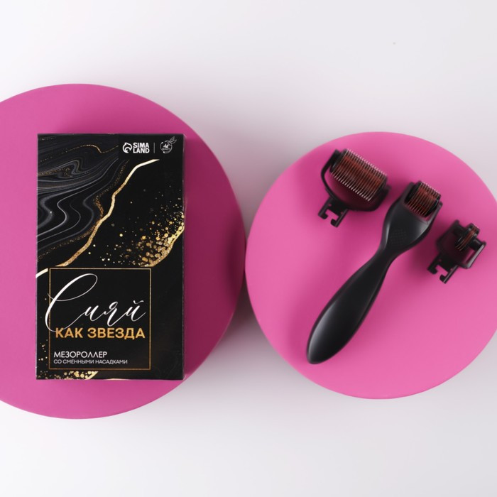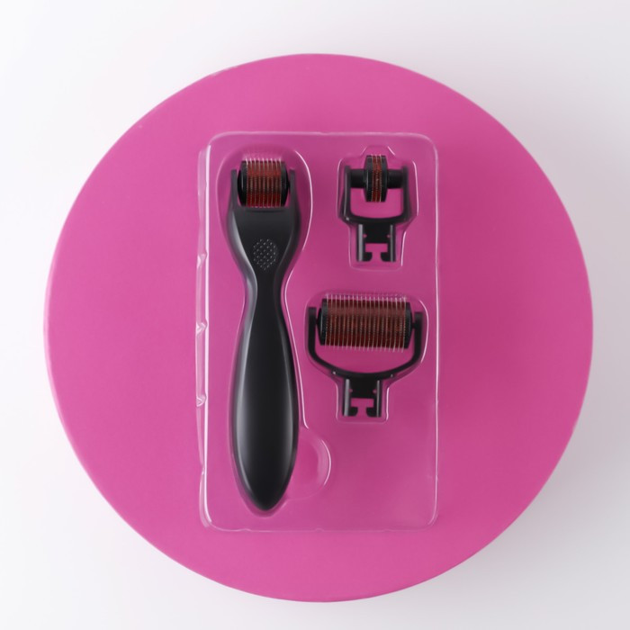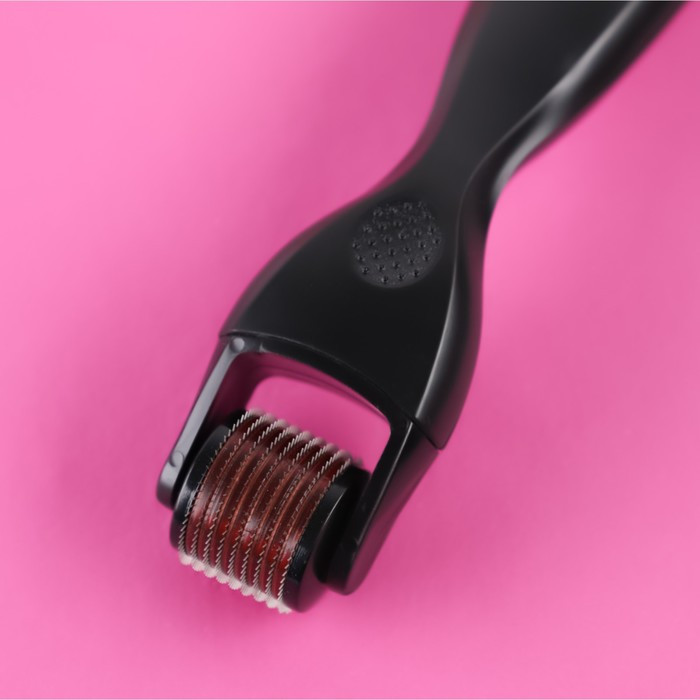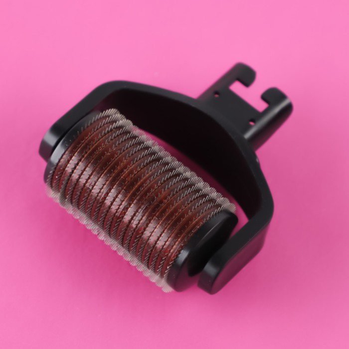 Мезороллер со сменными насадками для лица, головы и тела представляет собой валик с тончайшими иглами из стали.