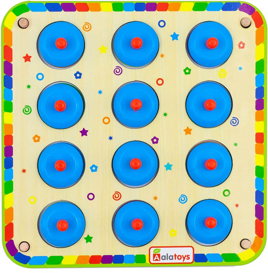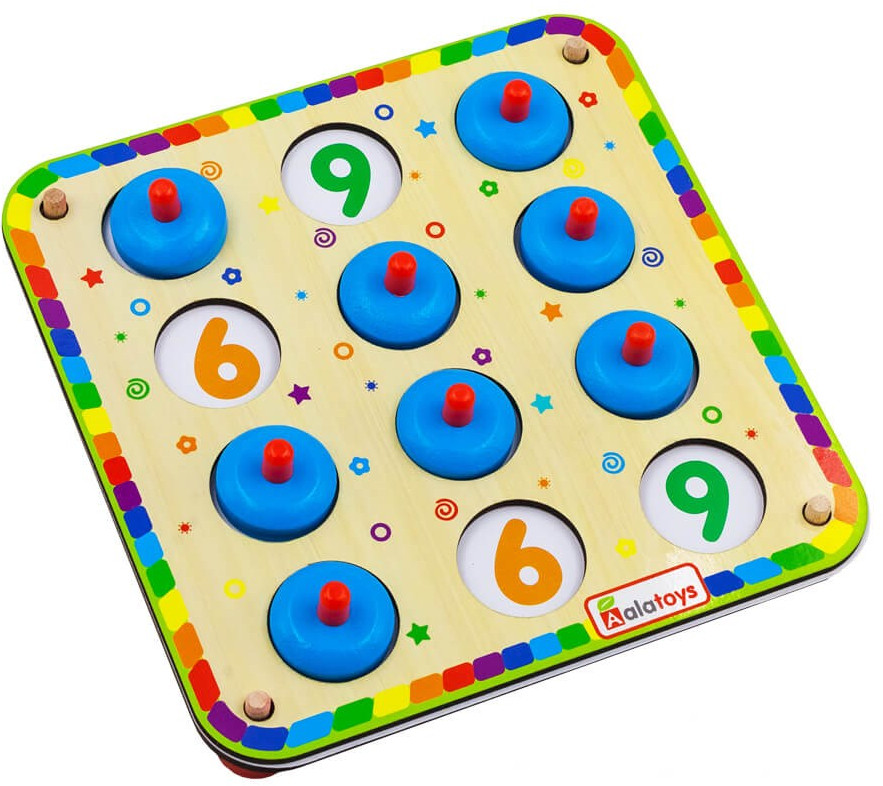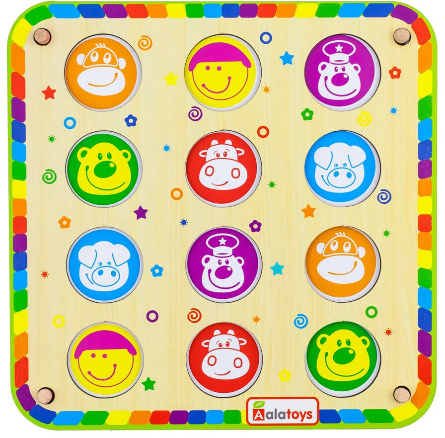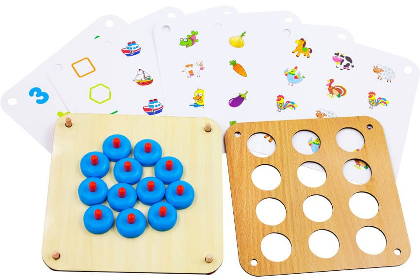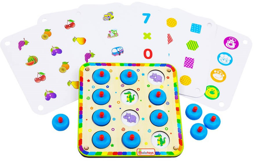 Мемори — новая игрушка от «Алатойс» для развития памяти. На шести двусторонних карточках представлены парные картинки по тематикам: персонажи мультфильмов и животные, транспорт и корабли, фрукты и овощи, геометрические фигуры и цифры. Картинки скрыты деревянными фишками. Задача игроков: открывая по одной фишке, найти пару. Эта игра увлекательная и полезная для памяти, воображения и речи ребёнка! Приятный вечер в кругу семьи вам обеспечен!
