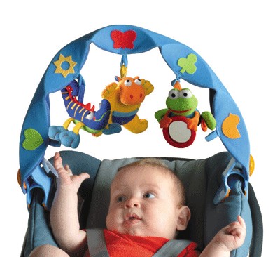 Очень хорошая вещь для развлечения малыша в дороге. Три мягкие игрушки, первая с зеркальцем, вторая при ударе проигрывает три короткие мелодии, третью малыш любим грызть:) Широкие клипсы удобны для крепления, сама дуга очень гибкая, может складываться в трое и выпрямляться в прямую, что позволяет крепить на любую ширину, к тому же дуга покрыта напылением типа бархат, приятна на ощупь. Испытали в дальней поездке, малышу очень понравилось, рекомендую.