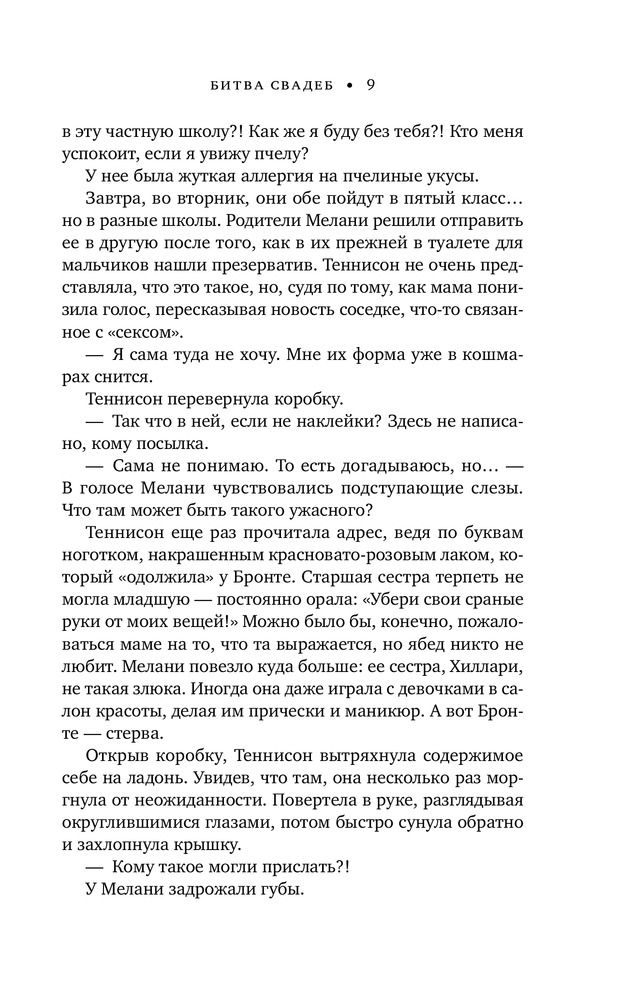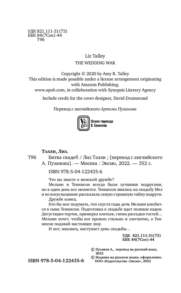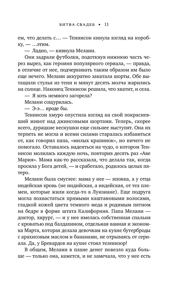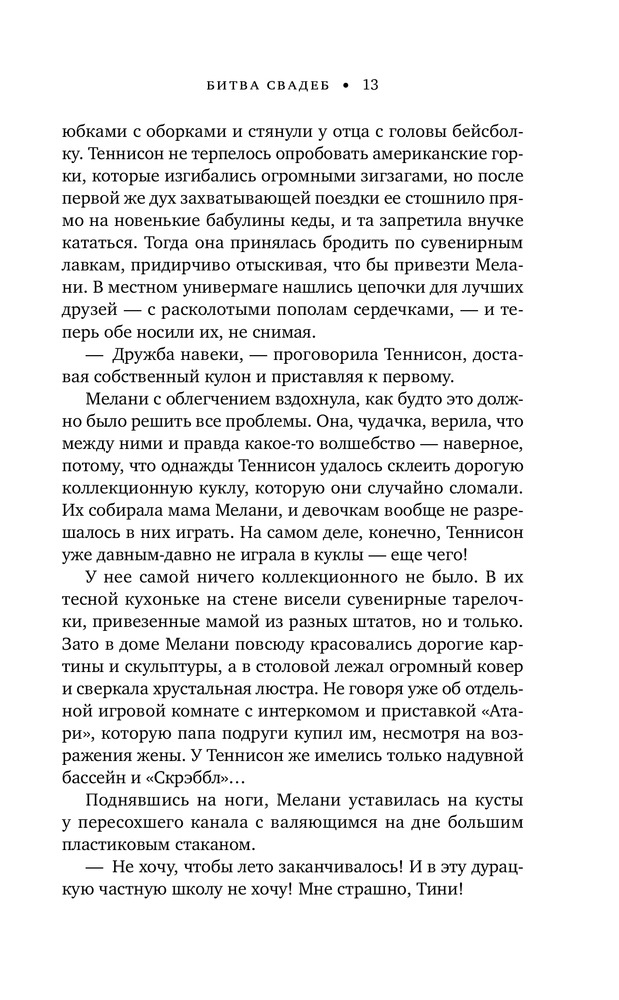 Битва свадебкачество бумага форзац шрифт содержание В данный момент этот товар отсутствует в продаже. Возможно, у нас найдется аналогичный или похожий товар здесь. Серия: Cupcake. Кинопремьера Что вы знаете о женской дружбе? Роман Лиз Тэлли заставит вас по-другому посмотреть на то, каково это — быть женщиной. Яркие и харизматичные герои «Битвы свадеб» не дадут вам заскучать. Вы будете переживать за каждую из женщин. Вам захочется поскорее увидеться с лучшей подругой и сказать ей, как сильно вы дорожите вашей дружбой. Это роман о прощении, решиться на которое сложно, но оно того стоит. Мелани и Теннисон были лучшими подругами, пока на свадьбе Мел не открылся страшный секрет, превративший крепкую дружбу в двадцать лет молчания. Но молчанию суждено прерваться. Дочь Мелани влюбилась в сына Теннисон. Все серьезно. На носу свадьба — не лучшее место встречи заклятых подруг. Дегустация тортов, примерка платьев, схема рассадки гостей... Каждая из женщин по-разному видит главное событие в жизни своего ребенка. Мелани — традиционалистка, ей подавай стиль и элегантность. А Теннисон мечтает превратить свадьбу сына в настоящее шоу. В этой войне участвуют только двое. И вот, наконец, наступает день свадьбы...«Дерзкий женский роман в лучшем его виде». — Мэрайя Стюарт «Стремительно развивающаяся история о дружбе и прощении». — Publishers Weekly «Герои Тэлли заставили меня смеяться и плакать». — Мэри Элен Тейлор |