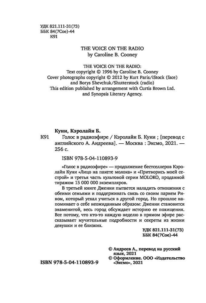 Голос в радиоэфире. Книга 3В данный момент этот товар отсутствует в продаже. Возможно, у нас найдется аналогичный или похожий товар здесь. Серия: MOLOKO. Кто-то разыскивает тебя по всей стране «Голос в радиоэфире» — продолжение бестселлеров Кэролайн Куни «Лицо на пакете молока» и «Притворись моей сестрой» и третья часть культовой серии MOLOKO, проданной тиражом 15 000 000 экземпляров. |