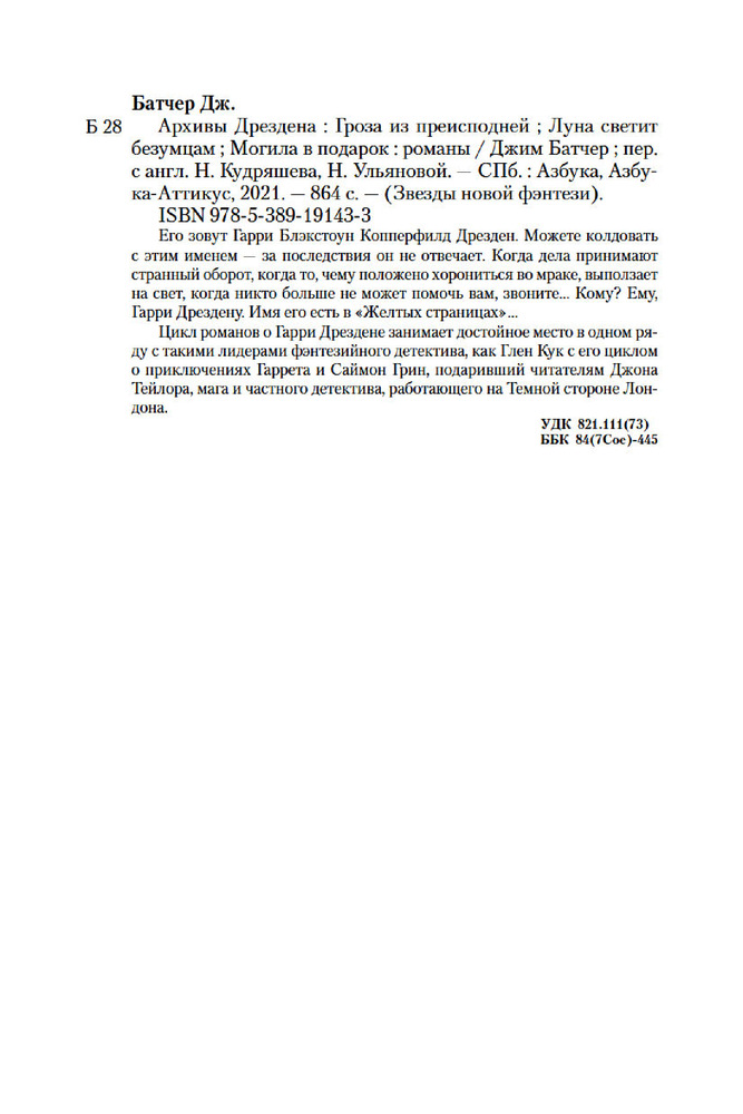 Архивы Дрездена: Гроза из преисподней. Луна светит безумцам. Могила в подарокВ данный момент этот товар отсутствует в продаже. Возможно, у нас найдется аналогичный или похожий товар здесь. Серия: Звезды новой фэнтези Его зовут Гарри Блэкстоун Копперфилд Дрезден. Можете колдовать с этим именем — за последствия он не отвечает. Когда дела принимают странный оборот, когда то, чему положено хорониться во мраке, выползает на свет, когда никто больше не может помочь вам, звоните... Кому? Ему, Гарри Дрездену. Имя его есть в «Желтых страницах»... |