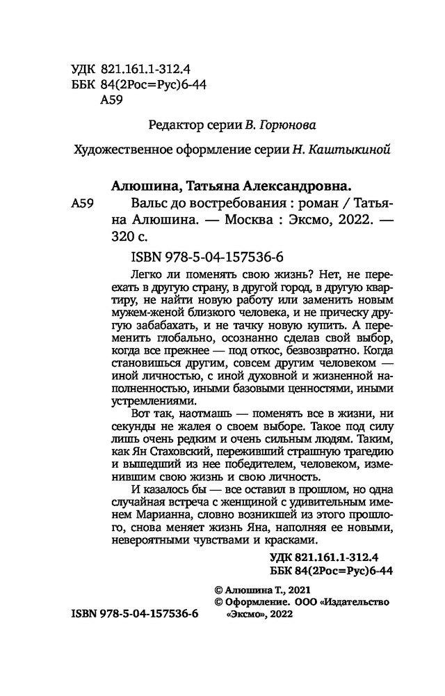 💳 Оплатить за товар можно при получении 🇰🇿 Есть бесплатная доставка по Казахстану 🎁 Копите бонусы с каждой покупки Серия: Еще раз про любовь. Романы Т. Алюшиной. Новое оформление (обложка) Легко ли поменять свою жизнь? Нет, не переехать в другую страну, в другой город, в другую квартиру, не найти новую работу или заменить новым мужем-женой близкого человека, и не прическу другую забабахать, и не тачку новую купить. А переменить глобально, осознанно сделав свой выбор, когда всё прежнее — под откос, безвозвратно. Когда становишься другим, совсем другим человеком — иной личностью, с иной духовной и жизненной наполненностью, иными базовыми ценностями, иными устремлениями. Вот так, наотмашь — поменять все в жизни, ни секунды не жалея о своем выборе. Такое под силу лишь очень редким и очень сильным людям. |