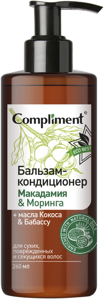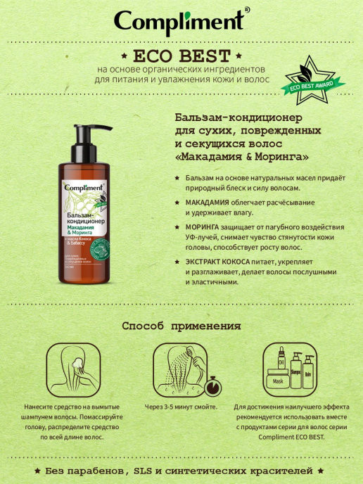 Compliment Бальзам-кондиционер для волос «Макадамия & Моринга»В данный момент этот товар отсутствует в продаже. Возможно, у нас найдется аналогичный или похожий товар здесь. Серия: Eco best Бальзам на основе натуральных масел восстанавливает оптимальный баланс влажности, обогащает питательными веществами, придаёт природный блеск и силу волосам. Без парабенов, SLS и синтетических красителей. |