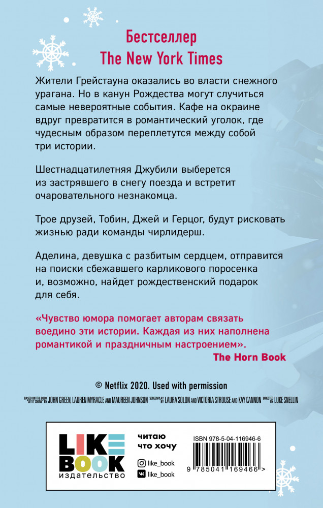Пусть идет снегЛорен Миракл, Джон Грин, Морин Джонсон В данный момент этот товар отсутствует в продаже. Возможно, у нас найдется аналогичный или похожий товар здесь. Серия: Young Adult. Кинообложка Жители Грейстауна оказались во власти снежного урагана. Но в канун Рождества могут случиться самые невероятные события. Кафе на окраине вдруг превратится в романтический уголок, где чудесным образом переплетутся между собой три истории. Шестнадцатилетняя Джубили выберется из застрявшего в снегу поезда и встретит очаровательного незнакомца. Трое друзей, Тобин, Джей и Герцог будут рисковать жизнью ради команды чирлидерш. Аделина, девушка с разбитым сердцем, отправится на поиски сбежавшего карликового поросенка, и, возможно, найдет рождественский подарок для себя. |