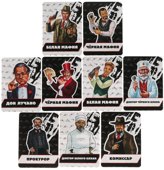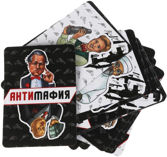 Умные игры Игра настольная «Антимафия»В данный момент этот товар отсутствует в продаже. Возможно, у нас найдется аналогичный или похожий товар здесь. Командная игра «Антимафия» ТМ «Умные игры» станет отличным вариантом интересно и весело провести время с семьёй или друзьями. С помощью данного набора можно поиграть в знаменитую «Мафию» в новой вариации. Два мафиозных клана не могут поделить город. Клан дона Карлеоне хочет переловить всех членов банды дона Лучано. Все мафиози похожи, и отличить их друг от друга может только прокурор. Жаль, что он тоже принадлежит к одной из банд. Только к какой — загадка. |