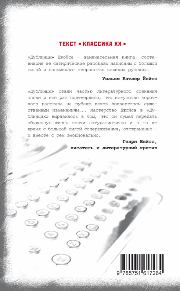 Я искал здесь Чехова, по чужой рецензии. Искал и не находил. Пробираться сквозь паралич Дублина было не просто. Скорее всего, я не понял автора (пока не понял). Отклик нашёлся лишь в двух рассказах из пятнадцати. Не пришло, видимо, время для модерна Д-Джойса. Все пятнадцать рассказов в переводе Е.Суриц. Белая бумага, среднего размера шрифт. Что будет с белой обложкой в случае, если книгу носить с собой в сумке, думаю говорить не стоит. Тем не менее, это издание по цене среднего похода в продуктовый, замечательное. Пахнет книга божественно.
