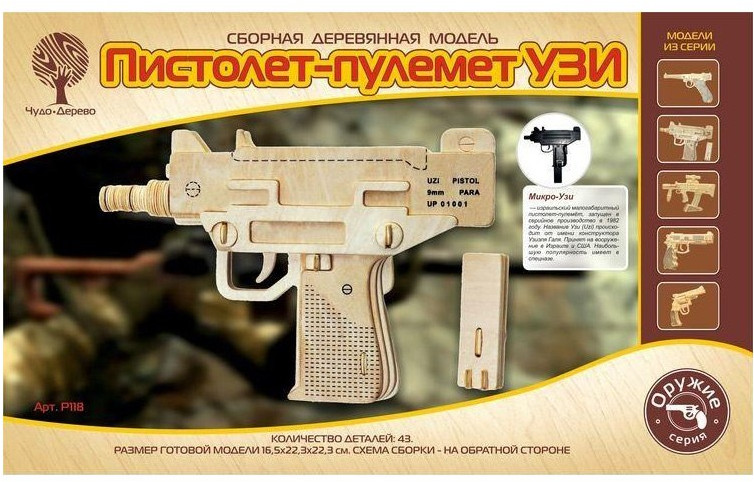 Чудо-Дерево Модель сборная деревянная «Пистолет-пулемет УЗИ»В данный момент этот товар отсутствует в продаже. Возможно, у нас найдется аналогичный или похожий товар здесь. Сборная деревянная модель. Детали скрепляются в порядке и очередности, обозначенной в инструкции. Для прочности соединений рекомендуется использовать клей ПВА (не токсичен, не имеет запаха, после высыхания становится прозрачным, имеет эластичный клеевой шов, при загустевании может |