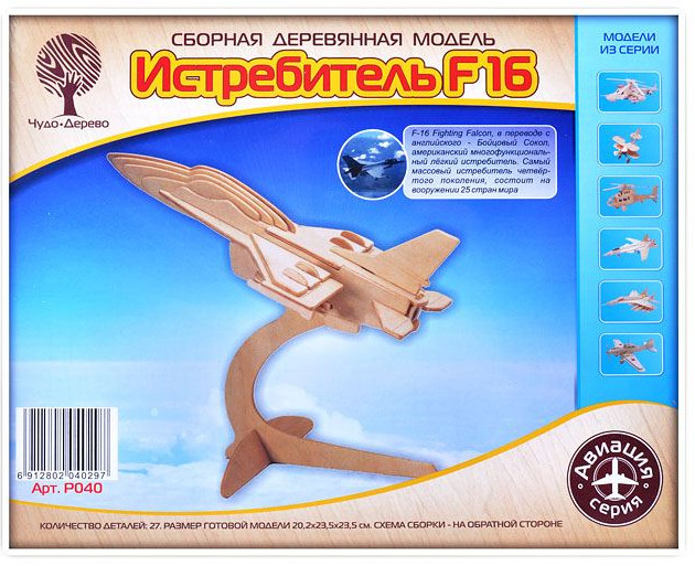 Чудо-Дерево Модель сборная деревянная «Самолет F16»В данный момент этот товар отсутствует в продаже. Возможно, у нас найдется аналогичный или похожий товар здесь. Сборная деревянная модель. Детали скрепляются в порядке и очередности, обозначенной в инструкции. Для прочности соединений рекомендуется использовать клей ПВА (не токсичен, не имеет запаха, после высыхания становится прозрачным, имеет эластичный клеевой шов, при загустевании может |