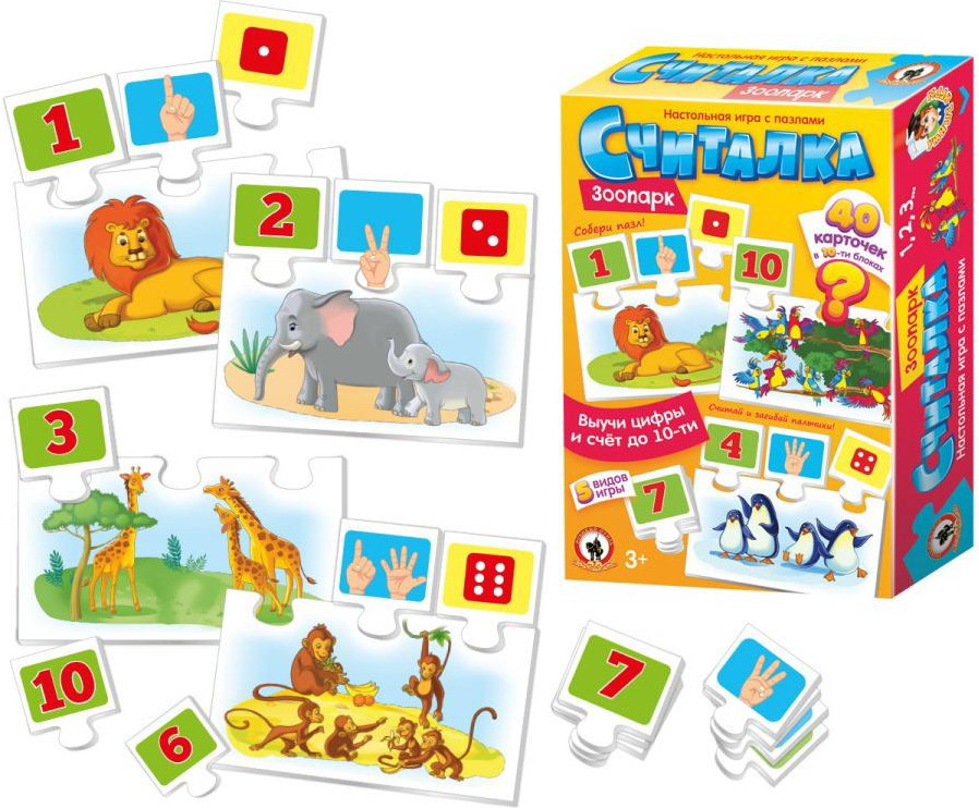 Русский стиль Игра настольная «Считалка. Зоопарк»В данный момент этот товар отсутствует в продаже. Возможно, у нас найдется аналогичный или похожий товар здесь. Серия: Умные игры Пазлы «Считалка. Зоопарк» созданы специально для маленьких детей от 3 до 6 лет. В наборе 40 карточек, которые складываются в 10 пазловых блоков. Детям необходимо посчитать животных на большой карточке, а затем подобрать соответствующую цифру, чкарточку с нужным количеством пальчиков и карточку с кубиком, затем собрать эти 4 карточки в единый пазл. Малыши смогут самостоятельно собирать пазлы, обучаясь порядковому счету от 1 до 10. Собирая пазлы, дети разовьют внимательность и усидчивость, мелкую моторику рук, научатся концентрировать внимание, сопоставлять контуры пазлов. Детали пазлов плотные, их удобно брать в руки. Игра рекомендована как для индивидуальных занятий с ребенком, так и для занятий в группе. |