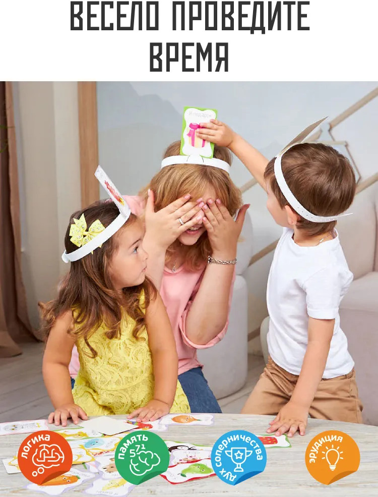 • игроки надевают обручи-диадемки и, не глядя, вставляют в них карточку. Рисунок на карточке видят все, кроме игрока, у которого она есть;