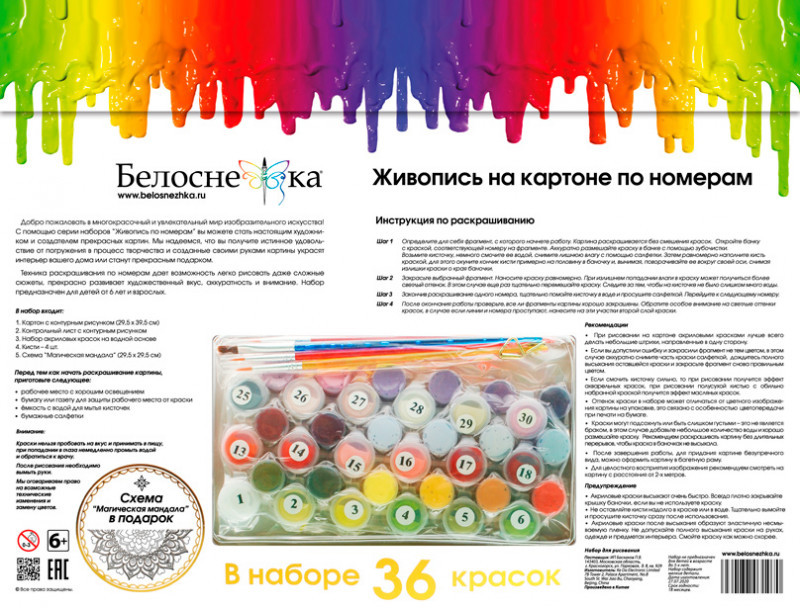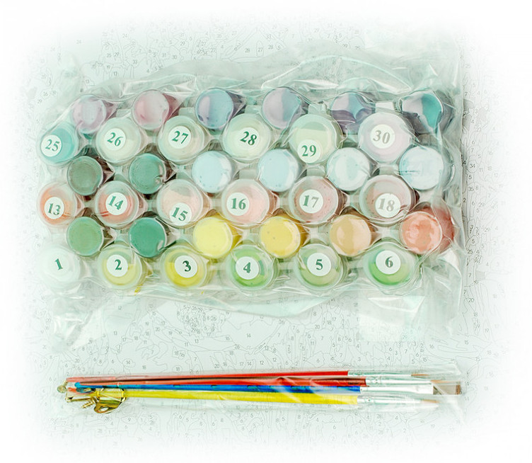 Внимание! Краски могут подсохнуть или быть слишком густыми — это не является браком, в этом случае добавьте небольшое количество воды и хорошо размешайте краску. Рекомендуем раскрашивать картину без длительных перерывов, чтобы краска в баночках не высыхала. |