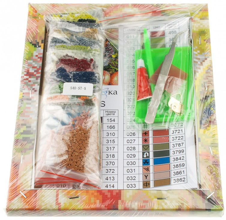 Основа работы — холст, на котором напечатана цветная схема с контрастными условными обозначениями, поверх нанесено клеевое покрытие и защищающая прозрачная плёнка. Используя прилагающийся металлический пинцет и комплект квадратных акриловых камней, вы отлично справитесь с заполнением каждого участка картины.