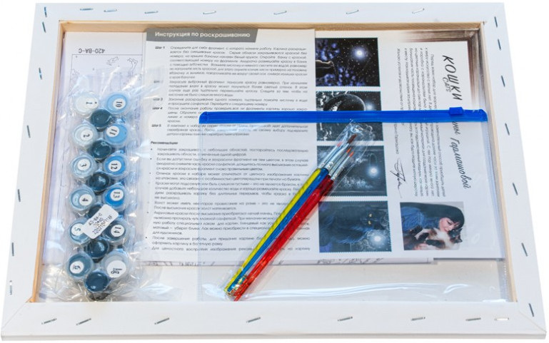Внимание! Краски могут подсохнуть или быть слишком густыми — это не является браком, в этом случае добавьте небольшое количество воды и хорошо размешайте краску. Рекомендуем раскрашивать картину без длительных перерывов, чтобы краска в баночках не высыхала.