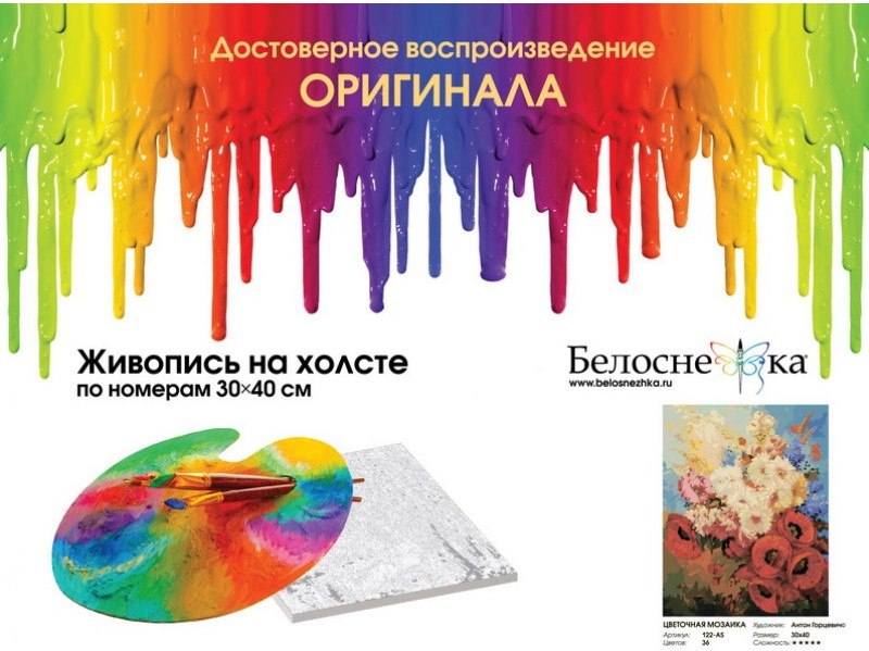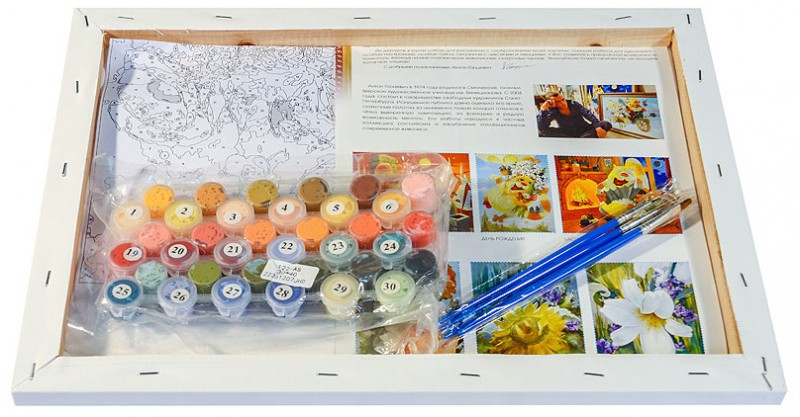 Внимание! Краски могут подсохнуть или быть слишком густыми — это не является браком, в этом случае добавьте небольшое количество воды и хорошо размешайте краску. Рекомендуем раскрашивать картину без длительных перерывов, чтобы краска в баночках не высыхала. |