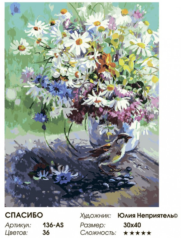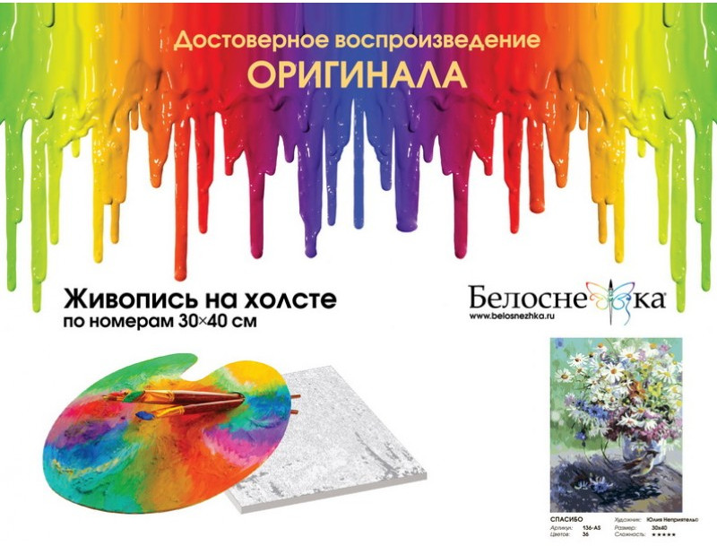 Внимание! Краски могут подсохнуть или быть слишком густыми — это не является браком, в этом случае добавьте небольшое количество воды и хорошо размешайте краску. Рекомендуем раскрашивать картину без длительных перерывов, чтобы краска в баночках не высыхала. |