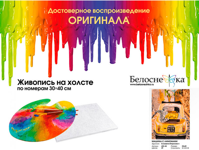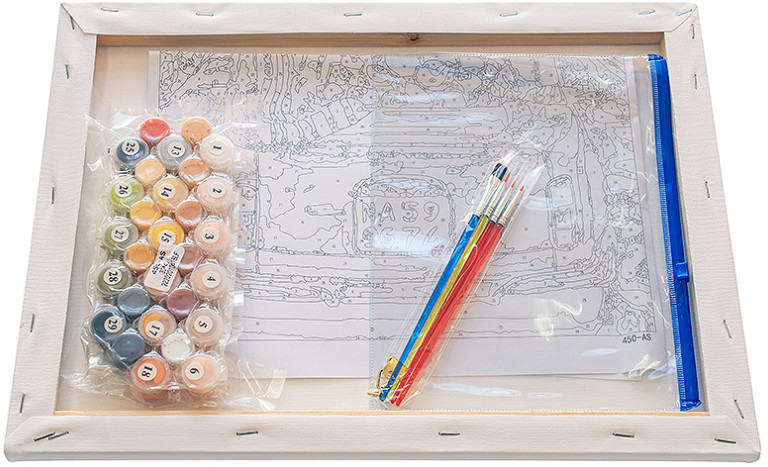 Основа картины — хлопковый холст на деревянном подрамнике с напечатанной схемой изображения. Холст загрунтован и полностью готов к нанесению краски, акриловые краски на водной основе экологически безопасны, номера на баночках соответствуют номерам на схеме. Количество красок достаточное для раскрашивания картины, даже в 2 слоя. Красивый сюжет, достоверное воспроизведение оригинала от «Белоснежки»!