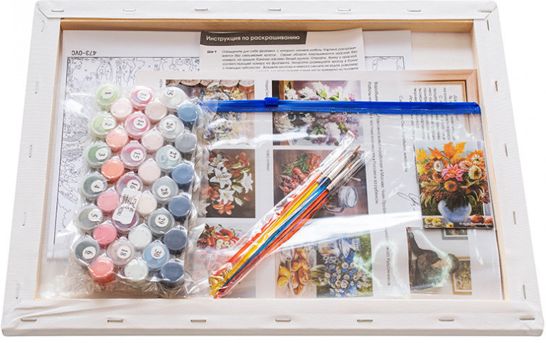 Внимание! Краски могут подсохнуть или быть слишком густыми — это не является браком, в этом случае добавьте небольшое количество воды и хорошо размешайте краску. Рекомендуем раскрашивать картину без длительных перерывов, чтобы краска в баночках не высыхала.