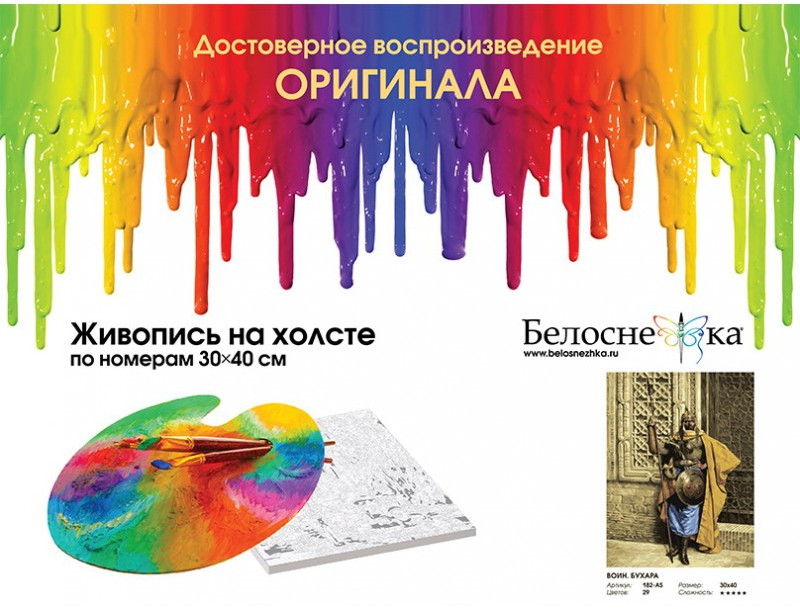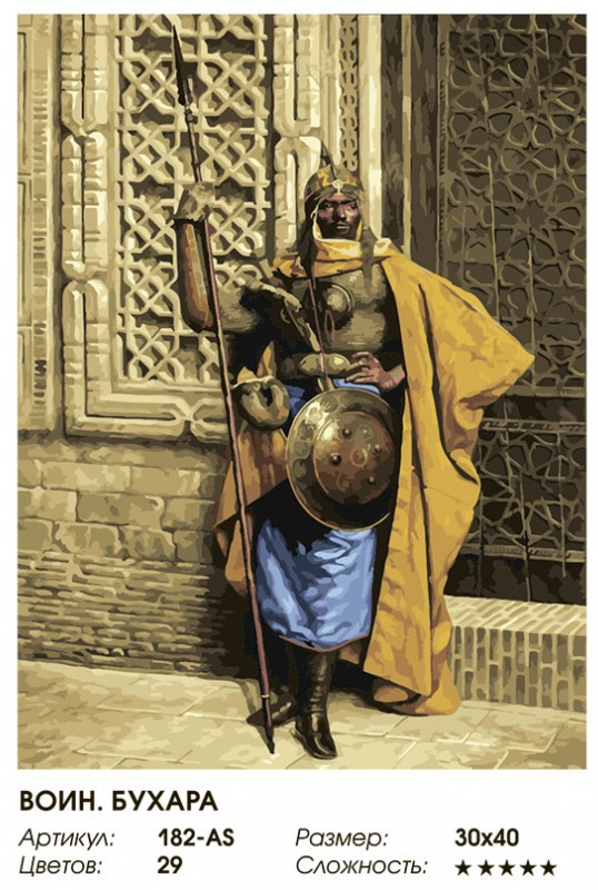 Белоснежка Картина по номерам «Воин. Бухара»В данный момент этот товар отсутствует в продаже. Возможно, у нас найдется аналогичный или похожий товар здесь. Серия: Люди В этом наборе вы найдете холст на подрамнике, на который нанесены контуры рисунка, а также числа, указывающие на цвет, которым должна быть закрашена та или иная часть картины. Наносите краску нужного цвета на холст при помощи кисти, сверяясь с контрольной схемой. Это спокойное, неторопливое занятие подойдет и ребенку, и взрослому, к тому же оно помогает развить цветовосприятие, аккуратность и художественный вкус. |