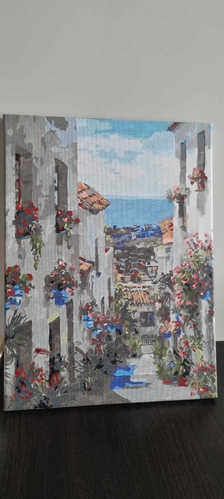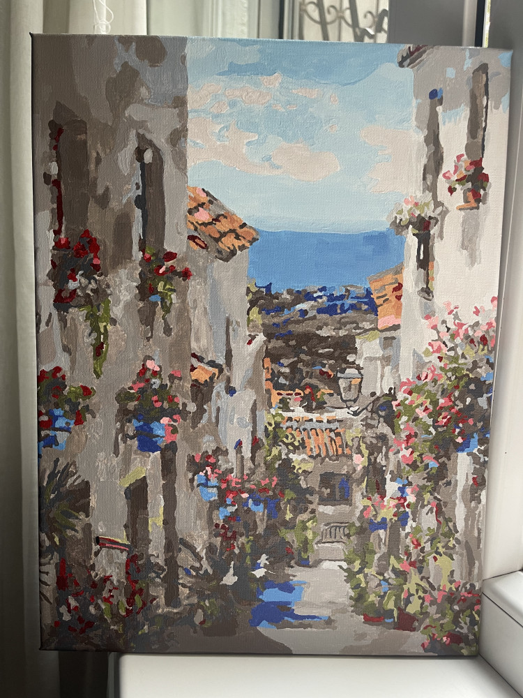 красивая картина, краски свежие, кисти хорошие. Доставка пришла вовремя, упаковка хорошая.